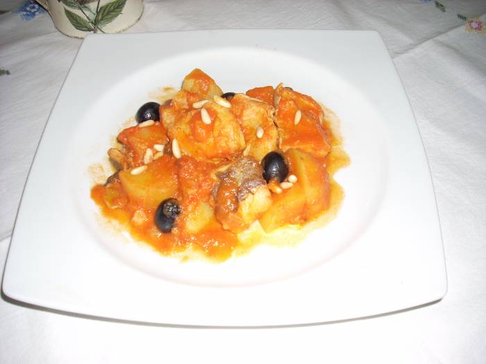 Si l'ho fatto, ma non ho fatto la foto. E' venuto molto buono, senza uvetta come ti avevo detto. Poi sai siccome il mio maritino non si sa mai quando torna... una volta cotto si è freddato... l'ho riscaldato... si è raffreddato... poi l'ho riscaldato di nuovo... insomma per farla breve qualche pezzetto più piccolo di baccalà con questo trattamento si è cotto troppo spappolandosi e disperdendosi nel sughetto