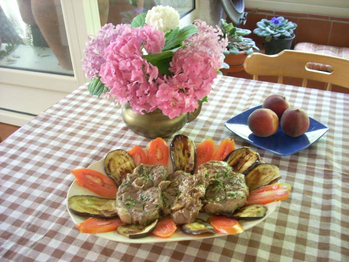 Bistecche di pecora alla griglia. Ingr. bistecche di carne di pecora ( parte della coscia ) aglio e prezzemolo, olio extra verg. oliv. Prendere abbondante aglio e prezzemolo e tritarli nel mixer. Metterli in una ciotola ed aggingerci dell'olio extra verg oliv Impregnare bene le bistecche con questo intingolo e farle riposare un paio d'ore. Mettere a cuocere sulla griglia rovente meglio se si cuoce su fuoco di brace. Non lasciarla cuocere troppo se nò diventa asciutta e coriacea. Salare a cottura avvenuta. E per finire......Prendere un bicchiere, una bella pesca e del vino fresco.Tagliare la pesca a pezzi e metterla nel bicchiere, versarvi dentro del vino fresco ( deve coprire parzialmente la pesca ) aiutandosi con uno stuzzicadenti prelevare i pezzi di pesca e...............buona!!!!!! occhietto