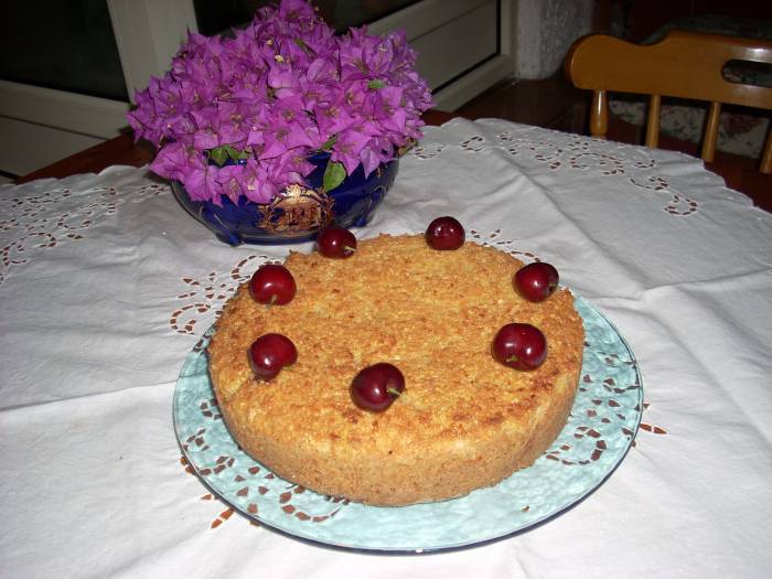 Lavare la frutta ed asciugarla, togliere il nocciolo alle ciliege, tagliare a fettine le pesche e mettere da parte. Tritare nel mixer le mandorle assieme ad un cucchiaio di zucchero e ridurle in farina. Montare le uova con lo zucchero fino ad ottenere un composto gonfio e spumoso. Aggiungere la farina di cocco, di mandorle ed il maraschino. Mescolare dal basso verso l'alto per non smontare tutto.