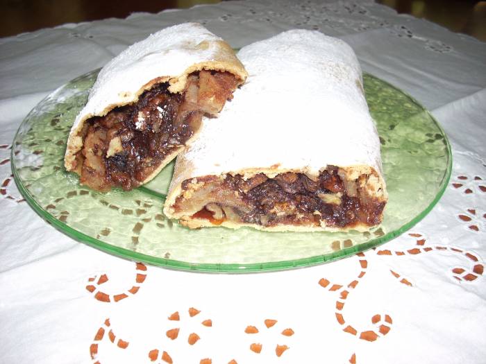 Oggi per San Valentino ho fatto uno strudel con pere e cioccolato. Una vera delizia !! Strudel con pere e cioccolato Per la sfoglia Ingredienti gr 240 di farina 00 gr 75 di olio di semi di mais gr 75 di acqua tiepida Per il ripieno ingredienti 4 pere abate 1 limone gr 70 di cioccolato fondente gr 70 di amaretti tritati gr 80 di gherigli di noci gr 80 di uva passa ammollata in acqua tiepida o nel liquore 2 cucchiai di zucchero Esecuzione Impatare la farina con l'olio e l'acqua tiepida. Lavorare alcuni minuti, fare un panetto liscio. Scaldare una pentola con dell'acqua bollente, svuotarla, metterla capovolta sul panetto di pasta. Lasciar riposare per mezz'ora. Prendere un canovaccio pulito , stendere la pasta in una sfoglia molto sottile aiutandosi con un mattarello o con i pugni chiusi messi sotto la sfoglia. Fare una sfoglia rettangolare. sbricciolare gli amaretti e coprire la sfoglia lasciando un bordo tutt'intorno Sbucciare le pere, tagliarle a metà ed eliminare il torsolo. tagliarle a fettine sottili. Spuzzarle con il succo del limone. Allinearle sugli amaretti Tritare grossolanamente i gherigli di noce. Versarli sulle pere. Unire l'uva passa sgocciolata e lo zucchero Tritare grossolanamente il cioccolato, cospargerlo sull'impasto. Piegare all'interno i due lati esterni Arrotolarlo aiutandosi con il canovaccio o la carta forno. Mettere in forno già caldo a 170° per 40 minuti. Far raffreddare e cospargerlo con zucchero a velo