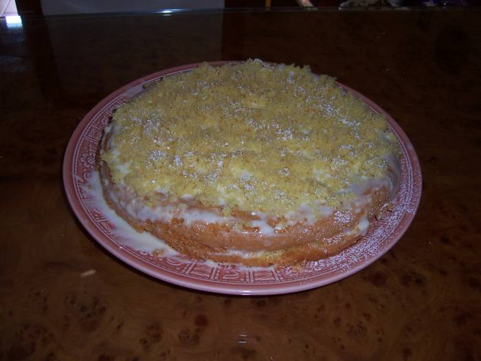 ingredienti per la farcitura: g. 250 di panna per dolci, un cucchiaio e mezzo di zucchero a velo, crema pasticcera, con 2 tuorli d'uovo, g. 75 di zucchero, g. 25 di farina, una abbondante scorza di limone, g. 250 di latte, zucchero a velo preparazione: si fa un pan di spagna con le uova intere, il pizzico di sale, lo zucchero, la vanillina, e con il mixer si comincia a sbattere, quando ha preso una certa consistenza si aggiunge la farina e si incorpora bene con il cucchiaio di legno agendo dal basso verso l'alto, si aggiunge poi il lievito e si incorpora bene, fatto questo, si imburra e si infarina la teglia, si versa il composto e si mette a cuocere a forno caldo a 200° per venticinque trenta minuti, una volta cotto, si toglie il pan di spagna e si lascia raffreddare, una volta freddo si divide in due dischi, si bagna la base con il limoncello e si prepara la panna montata aggiungendo lo zucchero a velo, si prepara poi la crema pasticcera con i tuorli d'uovo, lo zucchero, la farina, l'abbondante scorza di limone ed il latte e, a fuoco basso si mescola fino a quando la crema pasticcera diventa cremosa, poi, poco alla volta si versa con un cucchiaio la panna montata dentro la crema pasticcera e si mescola fino a che tutto sia ben amalgamato, questa farcitura si mette alla base della torta, poi si copre, ed anche la copertura si bagna con il limoncello e si ricopre con il resto della farcitura, si spargono poi sopra mollichelle di pan di spagna che saranno state tenute da parte e si cosparge con poco zucchero a velo e la torta mimosa al limoncello è pronta