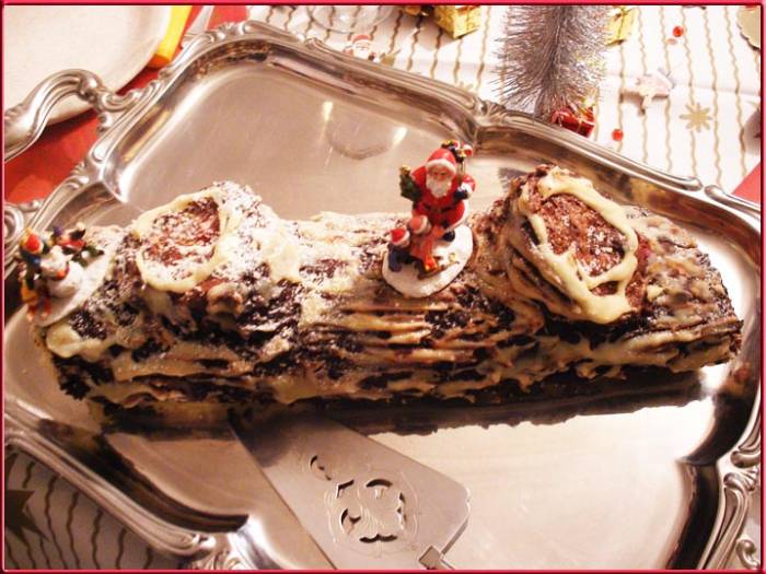 Dolci di tradizione in Francia .... è imancabile sul tavolo di Natale un pan di spagna rollato , bagna con siroppo di mandarino - ripieno di mousse di cioccolato nero e lamponi - ricoperto di cioccolato nero e dicorato con cioccolato bianco .